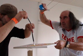 Das letzte Spiel hatte zudem noch einen positiven Nebeneffekt für die Mitglieder. Die Bilder wurden alle zugunsten der Fanclubkasse meistbietend versteigert. Auktionator war kein geringerer als August Schrader. Das Startgebot lag bei jeweils 10 Euro. Das erste Bild „Küss mich" ging noch für zurückhaltende 17 Euro weg. Das Bild „Schön ist es, auf der Welt zu sein" ging für 20 Euro unter den Hammer und wird beim jüngsten Orthopäden im Kinderzimmer einen schönen Platz finden. Bei den „Fahrenden Musikanten" lieferten sich einige Fans das erste Kopf an Kopf Rennen. Der Auktionator rief beim Gebot von 25 Euro aus: „Wir nehmen auch Automobile an!". Schließlich wurde das noch feuchte Bild von Addi an Melanie als Höchstbietende für 30 Euro überreicht. Guildos Erkenntnis nach den ersten erfolgreichen Auktionen: „Wir hören auf zu musizieren und malen nur noch Bilder!". Dann kam es bei der Versteigerung zu dem Bild mit dem meisten Interesse. Bei „Frisörsalon" dürfte man auch schon tiefer ins Portemonnaie greifen, also wurde das Stargebot auf 15 Euro erhöht. Ich sagte prompt: „20 Euro!" – darauf Guildo: „Ich hab’s gewusst!". Die Gebote schaukelten sich hoch bis auf 50 Euro. Bis Schrader noch hinzufügte: „50 Euro für alles was der Meister zu bieten hat, ist nicht zu wenig – höre ich 60?". Beim vorletzten Gebot von 59 Euro legte ich noch einen drauf und ergatterte mir dieses besondere Bild für 63 Euro. Wie sagte Schrader so schön: Alles was der Meister zu bieten hat, auf diesem kleinen Stückchen Blatt DIN A 4. Trockne es, häute es, und klebe es ein in dein POesiealbum!". Entgegen der Vermutung von Guildo, dass ich eine Haaranalyse durchführen lassen wolle, hat das gute Stück mit all seinen Bestandteilen einen Ehrenplatz gefunden. Das höchste Gebot wurde ganz zum Schluss auf das Bild „Guildo Horn & Die Orthopädischen Strümpfe" abgegeben. Am Ende war Nicki der Glückliche und durfte das Bild für 80 Euro mit nach Hause nehmen. So flossen insgesamt stolze 210 Euro in die Vereinskasse.