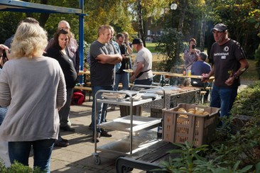 Bei strahlenden Sonnenschein wurde inzwischen der Grill auf der Terrasse angeworfen und nach seiner Ansprache und ein paar Smalltalks begaben sich Silke und Guildo direkt dort hin, um für uns alle die Würstchen auf den Grill zu schmeißen, denn der Hunger machte sich schon breit.